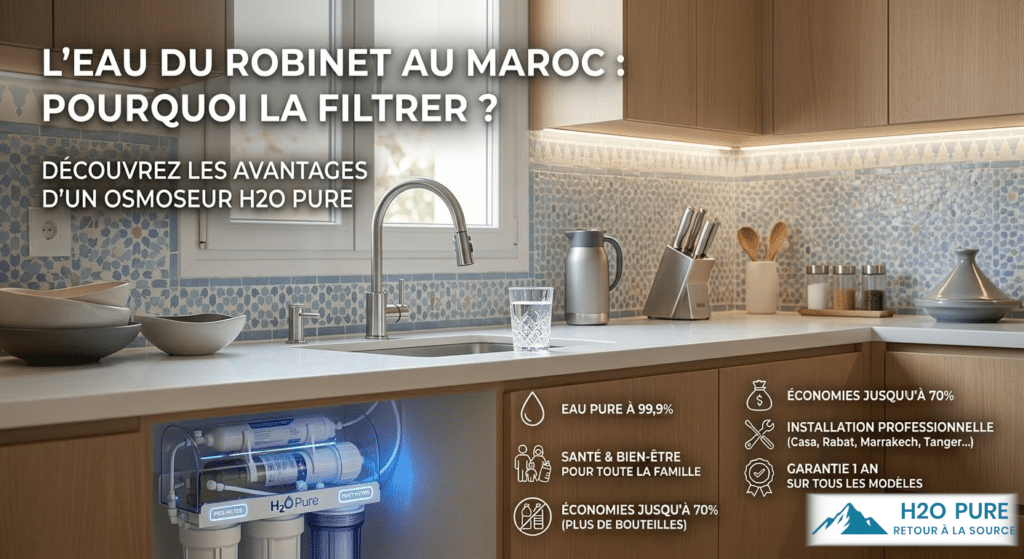 Dans plusieurs régions du Maroc, l’eau du robinet est potable mais souvent chargée en calcaire, chlore ou en impuretés microscopiques.