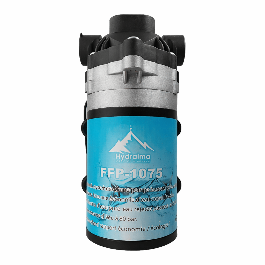 La pompe métal 8 bars Hydralma est une pompe métal osmoseur conçue pour augmenter la pression et améliorer la qualité de la filtration. Avec une pression plus stable, la membrane travaille dans de meilleures conditions. Ainsi, vous obtenez une eau plus pure et plus régulière au robinet.